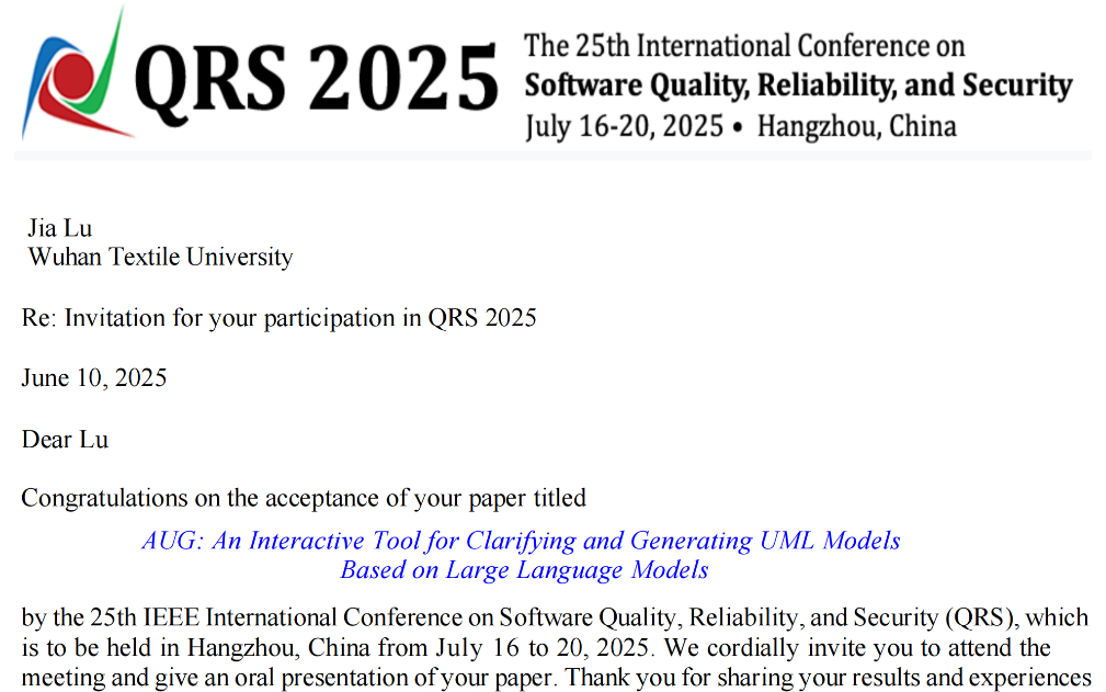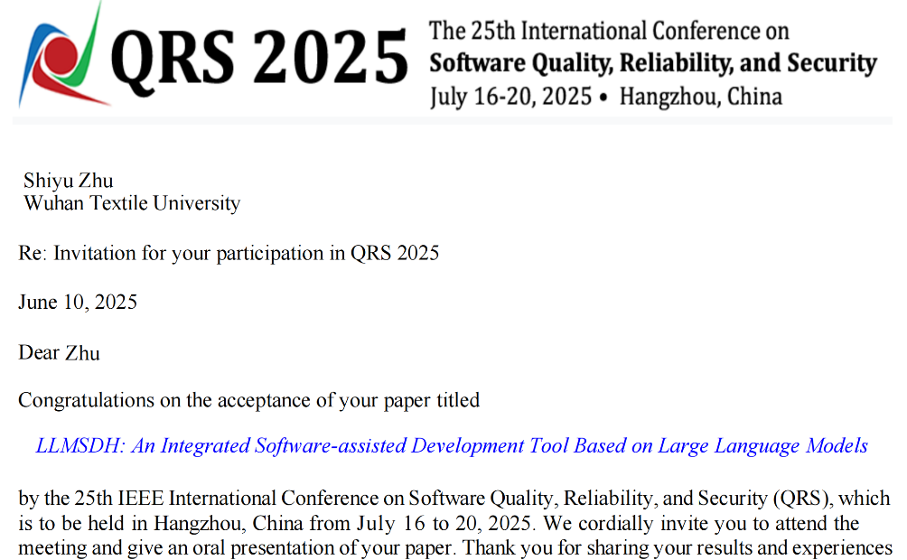 近日,第25届软件质量、可靠性和安全国际会议(25th IEEE International Conference on Software Quality, Reliability, and Security, QRS 2025)公布了今年的论文录用结果,软件工程2022级本科生卢佳、朱诗雨同学分别作为第一作者的两篇论文,均被大会录用发表。据悉,QRS会议是中国计算机学会(CCF)推荐的C类会议,也是软件可靠性领域排名第二的国际学术会议。两篇论文的录用发表,展现了软件工程专业的本科生在人工智能赋能软件工程(AI4SE)领域的最新研究进展。