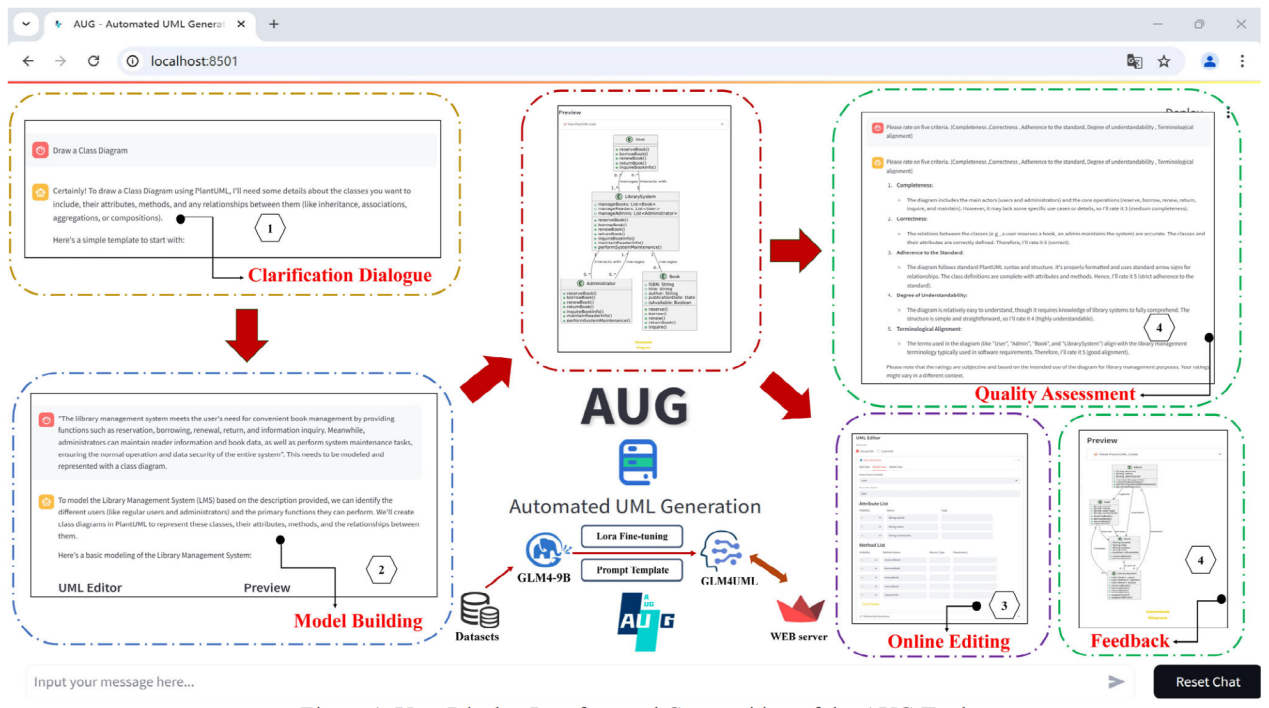卢佳同学的论文《AUG: An Interactive Tool for Clarifying and Generating UML Models Based on Large Language Models》指出:需求建模在软件开发中至关重要,然而手动开展UML建模活动既耗时又容易出错。现有的基于大语言模型(LLM)的方法通常依赖PlantUML解析等间接手段实现,导致其适应性不足。为应对这些挑战,该员工团队研发了一款名为AUG(Automated UML Generation)的工具。该工具是一款由GLM4UML模型驱动的交互式工具,专注于自动化UML建模,尤其适用于类图、用例图和序列图的生成。AUG集成了动态编辑、质量评估与反馈机制,构建了一套自动化评估与优化范式。通过构建包含10000条数据的数据集,并采用提示学习技术对GLM4-9B进行微调以提升模型性能。实验结果表明,AUG的精确率、召回率和F1值分别达到78.68%、67.37%和72.59%,优于四种开源大语言模型(比较基线)。此外,该篇论文通过问卷调查进一步验证了AUG的高可用性与高效性,并展现了用户的高满意度。