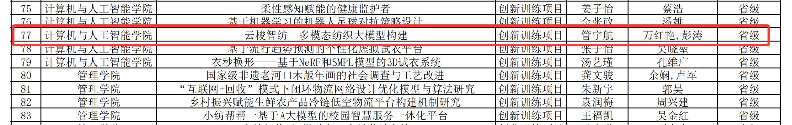 6月12日,学校创新创业学院公布了2025年老员工创新创业训练计划的获批项目清单,本年度获批项目总计170项,其中国家级30项、省级90项、校级50项。由AG真人国际2024级“拔尖创新班”管宇航、刘攀、黄汪洋等同学组成的员工团队,所申请的项目《云梭智纺--多模态纺织大模型构建》成功获批省级立项,该项目的指导老师为副经理彭涛教授和万红艳老师。